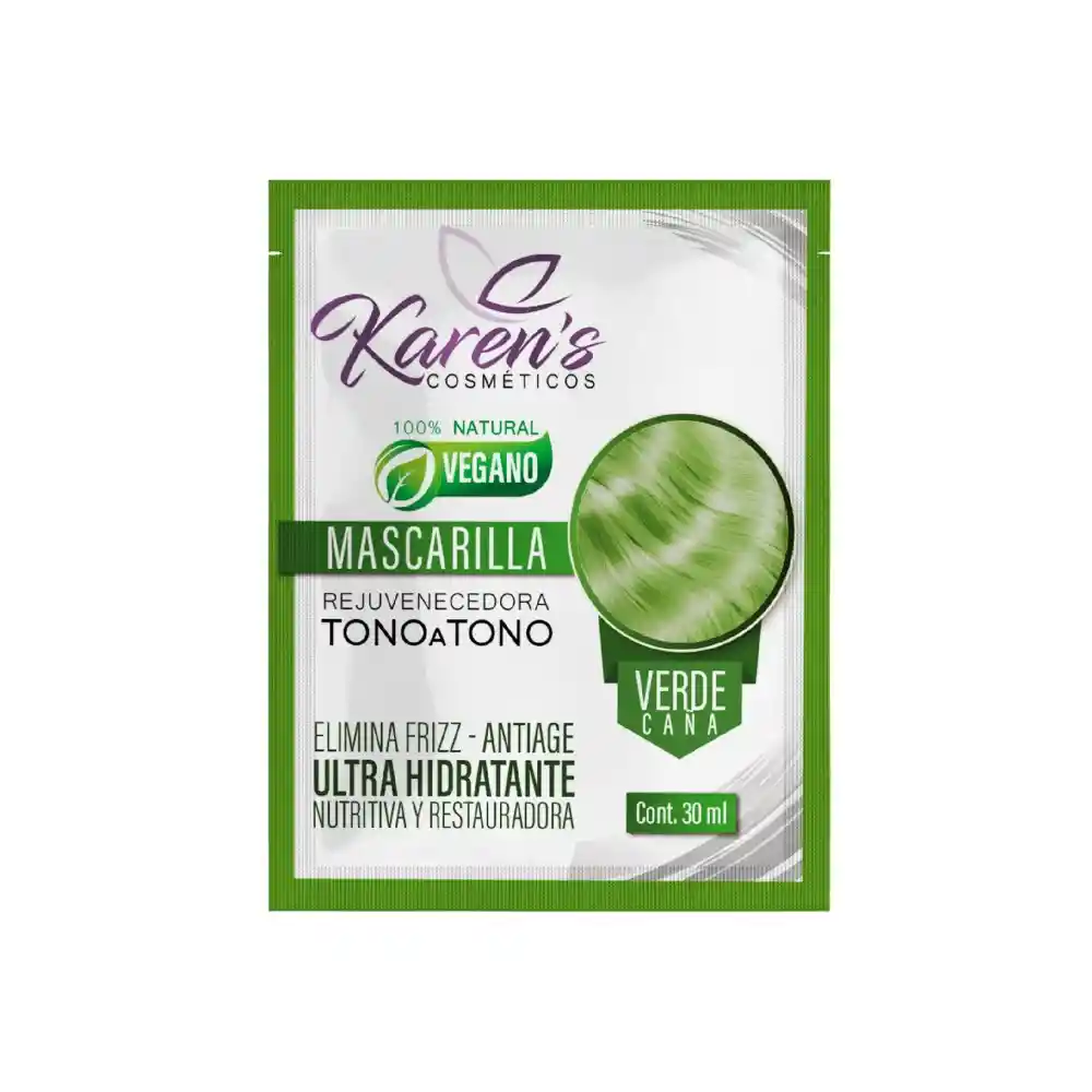 Mascarilla Matizante Rejuvenecedora Tono sobre Tono VERDE CAÑA PRODUCTO VEGANO Contiene: 30ml Sachet Bondades: ELIMINA FRIZZ – ANTIAGE ULTRA HIDRATANTE NUTRITIVA Y RESTAURADORA 100% NATURAL – VEGANO La MASCARILLA REJUVENECEDORA TONO A TONO contiene una concentración excepcional de nutrientes en su composición, tales como proteínas, aminoácidos y vitaminas que restauran el cabello, brindándole beneficios como elasticidad, equilibrio y fuerza, que le dan una mejor textura y sedosidad. Todos estos nutrientes le dan vida y salud al cabello, mejoran su peinabilidad, aportan sedosidad, elasticidad y más brillo. Bondades: - Alto Brillo - Reparación Intensa - Sedosidad Extrema - Peinabilidad - Nutrición Profunda - Vitalidad.