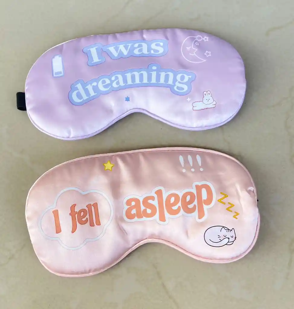 (material suave y liso), tienen forma curva para cubrir los ojos y presentan diseños divertidos: 1. Mascarilla púrpura: dice “I was dreaming” (estaba soñando) 2. Mascarilla rosa: dice “I fell asleep” (me quedé dormido)