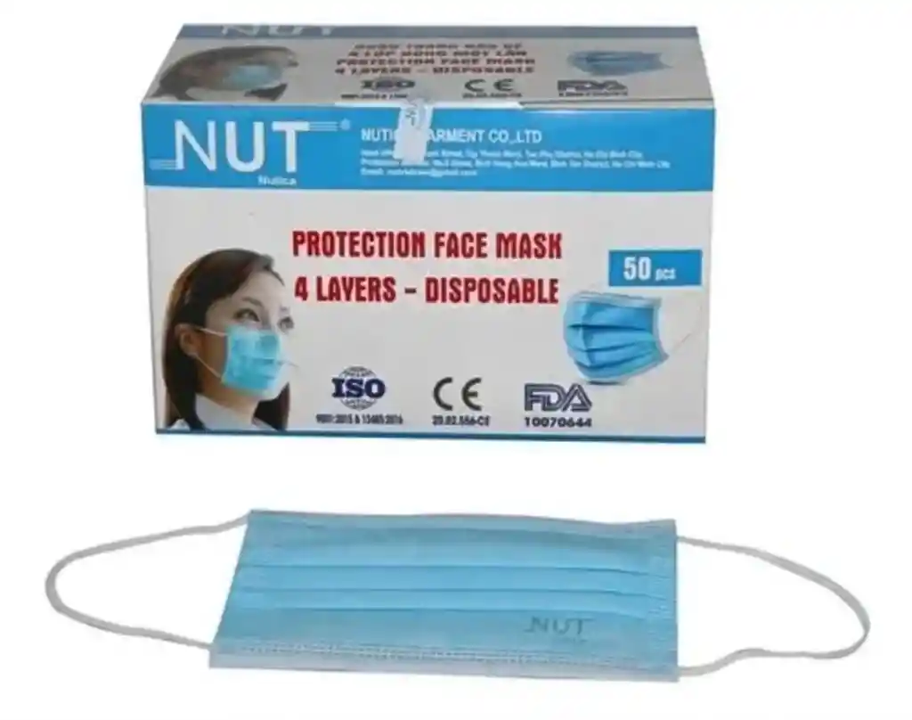 Este producto es una caja de mascarillas desechables de la marca NUT. La caja indica que contiene 50 piezas y que las mascarillas están compuestas por 4 capas para una mayor protección. También cuenta con certificaciones como ISO y FDA, lo que sugiere que cumple con ciertos estándares de calidad y seguridad. El diseño de la caja muestra una imagen de una persona usando la mascarilla, lo que refuerza su propósito de protección facial.