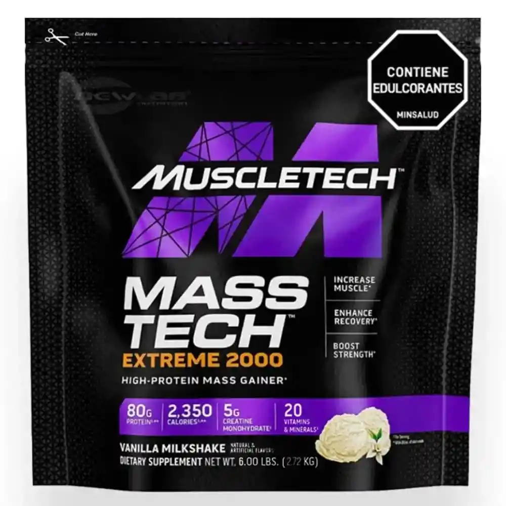 Masstech Muscletech tiene todo lo que necesitas para incrementar tus músculos agregando tamaño y fuerza. Tómalo para obtener los beneficios de avanzado y poderoso potenciador de la fuerza mejorada. Se trata de un alimento en polvo formulado a base de proteína de suero concentrado, aislado y un complejo de carbohidratos. Gracias a su alto contenido calórico, con 2330 calorías por servicio, la Mass Extreme 2000 es perfecta para aquellos que buscan un incremento significativo en su volumen muscular. Su fórmula incluye 17,5 gramos de aminoácidos esenciales y 20 vitaminas y minerales, lo que contribuye a una nutrición completa y equilibrada. Contenido neto: 6 libras (5 servicios) Tamaño de porción: 570 g (6 cucharas medidoras) Proteína por porción: 80 g* Monohidrato de creatina: 5 g* Calorías por servicio: 2330* Aminoácidos esenciales: 17.5 g* Modo de uso: 1 servicio diario dividido en 3 tomas Método de conservación: mantener en un lugar seco y fresco. Lejos del alcance de los niños *Los valores pueden variar según el sabor y lote del producto.