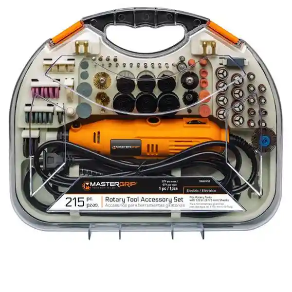 Set Mastergrip Contiene 215 Unidades Ca Tendrás Todo lo Necesario Para Realizar Tus Proyectos de Hobby Hogar y Oficina. Con Una Potencia de 135W y Una Velocidad Sin Carga de Hasta 33000 Rpm Podrás Esmerilar Tallar Lijar Perforar Pulir y Cortar Con Precisión. El Estuche de Inyección Mantendrá Todo Organizado y Listo Para el Almacenamiento y Transporte. Incluye Una Amplia Variedad de Accesorios Como Brocas Muelas Discos de Corte y Más. ¡Potencia y Versatilidad en un Solo Estuche!.