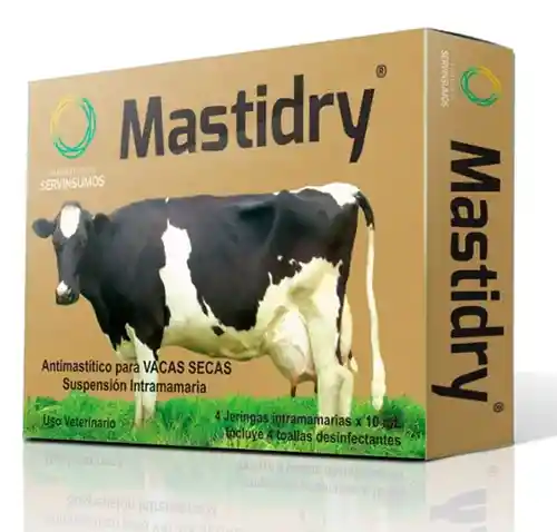 Cloxacilina benzatínica, Ampicilina trihidrato. Prevención de la MASTITIS EN EL PERIODO SECO de las vacas. Formulación de EFECTO PROLONGADO. Debe ser aplicado después del último ordeño de lactación previa desinfección y escurrimiento de los pezones; utilizar el contenido de una jeringa por cuarto afectado. Hacer masaje sobre la ubre para ayudar a una mejor difusión del medicamento. En caso de mastitis clínica aplicar Mastidry en el cuarto afectado con la frecuencia que indique el médico veterinario. Como terapia de secado se aconseja tratar todos los cuartos de todos los animales que inicien el periodo de secado. Presentación: 1 Caja con 4 jeringas de 10 ml