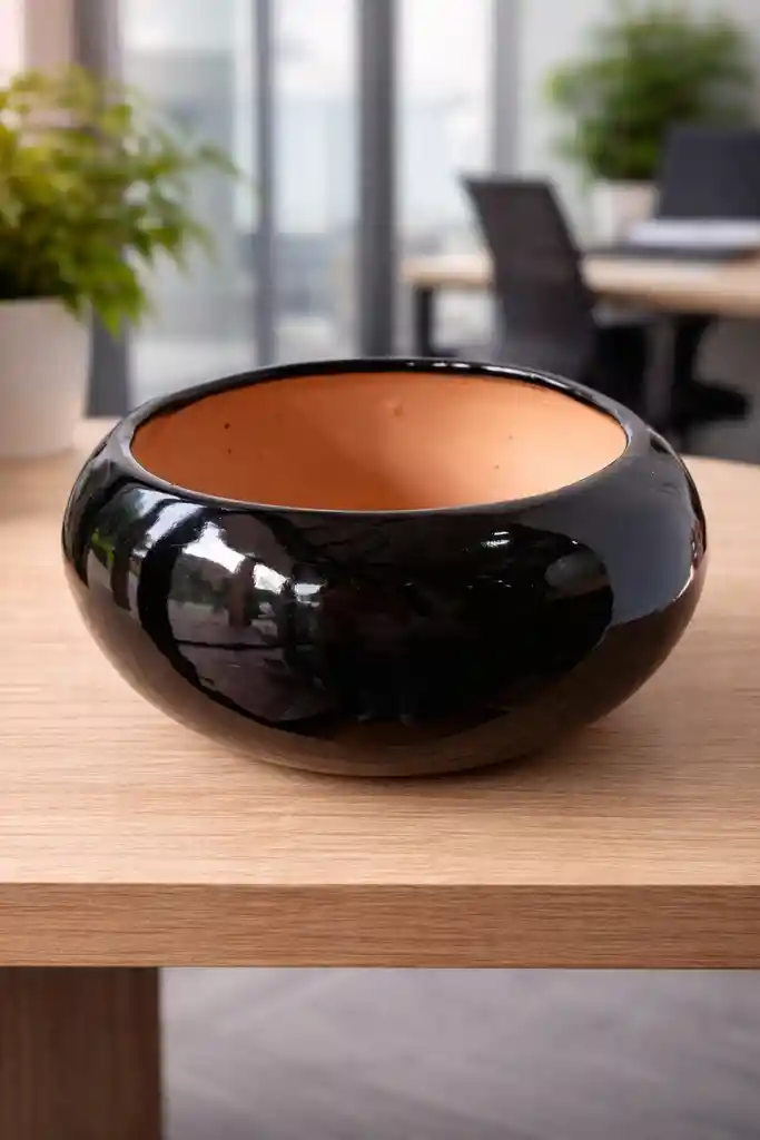 Elegante matera de diseño moderno, elaborada en cerámica de alta calidad con acabado brillante en color negro, ideal para realzar cualquier planta o bonsái. Características: -Diseño redondo y minimalista -Acabado brillante tipo espejo que aporta elegancia -Interior en tono terracota natural -Cuenta con orificio de drenaje (ideal para la salud de la planta) -Perfecta para bonsáis, suculentas u orquídeas -Medidas 19cm x 15 cm altura aprox.