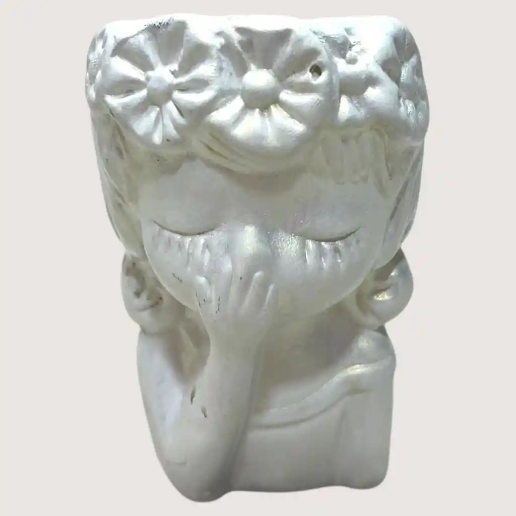 Dale un toque tierno y encantador a tu espacio con esta matera en cerámica mini con forma de rostro, en color rosa suave con detalles dorados 💖🌟. El diseño muestra un rostro de ojos cerrados, con una delicada corona de flores y las manos cubriendo suavemente la boca, transmitiendo una expresión dulce y serena 🌸😌. La cerámica tiene una textura ligeramente rugosa, decorada con salpicaduras doradas que simulan motas o destellos mágicos ✨. Perfecta para suculentas, cactus pequeños o como pieza decorativa única 🏡🪴💫. 📦 Se envía en el color disponible en tienda al momento de la compra.