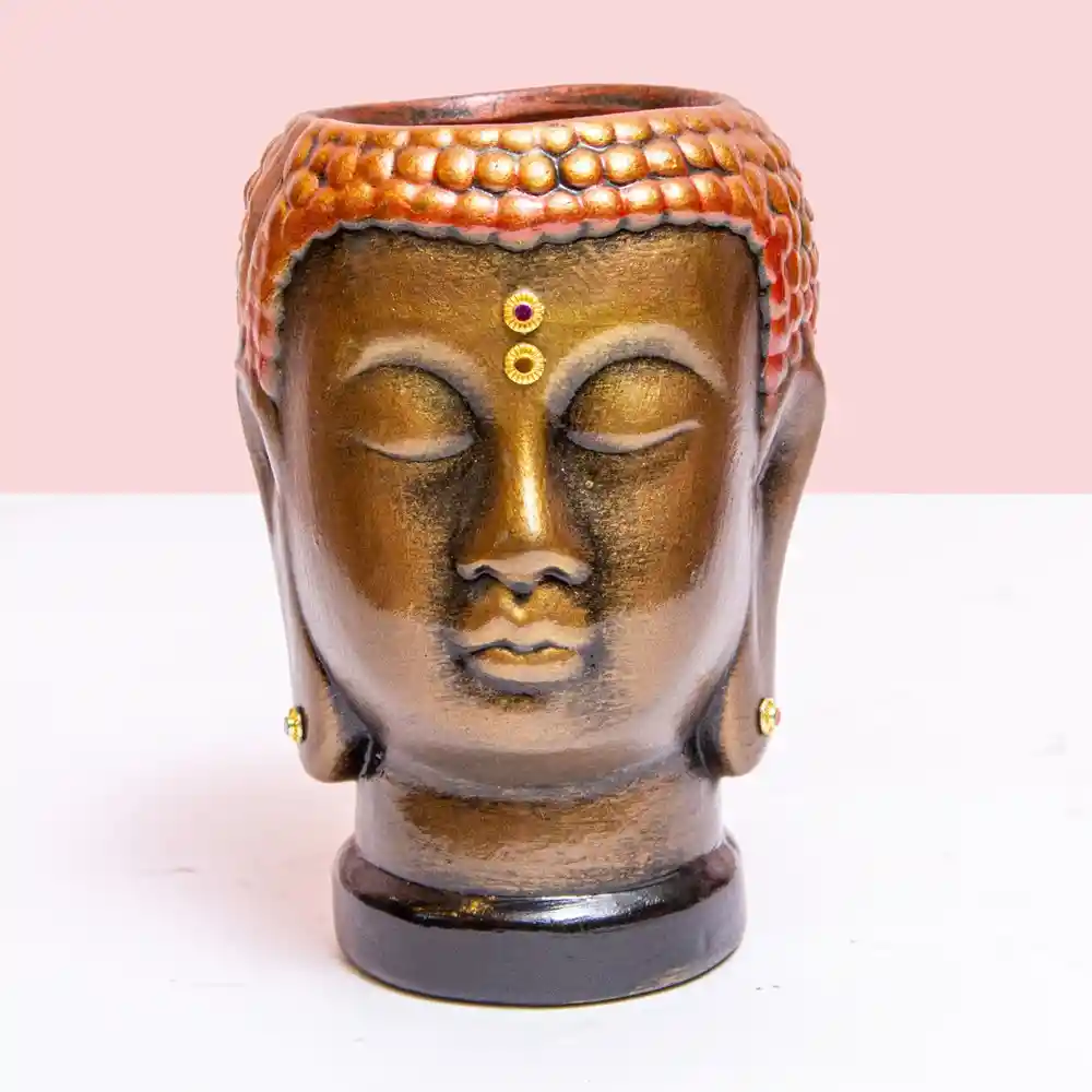 Esta matera representa la serenidad del Buda con un acabado dorado envejecido y toques rojizos que resaltan su textura y expresividad. Los delicados apliques brillantes en la frente y las orejas le dan un aire sofisticado y místico. Perfecta para espacios de meditación, decoración zen o como acento único en cualquier ambiente. Una pieza que transmite paz y buen gusto en cada rincón.