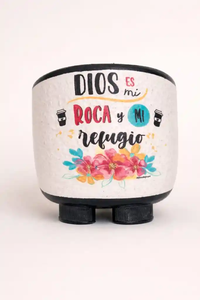 Matera plástica artesanal, elaborada con base de plástico transformado, patas remachadas, decorada y estampada.