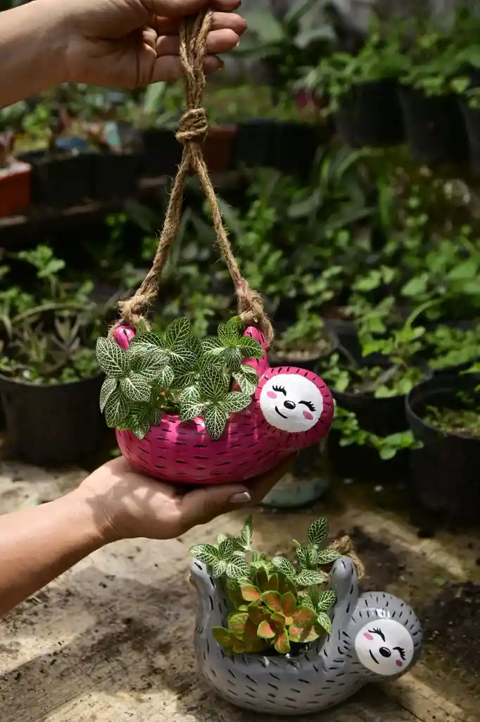 Matera en forma de perezoso en material porcelanato, color gris o salmón, medidas: 15cms de largo, 7 cm de ancho, 8 cms de alto incluye cactus o suculenta, Iluminación: Luz indirecta Riego: Minimo, Verificar que el sutrato esté seco entre riego y riego. Sustrato: Mezcla de minerales y nutrientes. Abono: no es muy necesario. Si deseas abonarla utiliza abono especial para cactus y/o suculentas, solo una vez al mes.