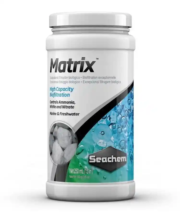 Presentacion 250 ml 250 ml de Matrix tratan 200 litros de agua. Biofiltración de alta capacidad. Controla amoníaco, nitrito y nitrato. Altamente poroso - enorme superficie (> ~ 700 m 2 / L) Admite especies de bacterias aerobias y anaerobias MATRIX es un medio biologico de alta porosidad inorgánica que aporta una eficiente biofiltración para la eliminación de residuos nitrogenados (amoníaco, nitratos y nitritos).