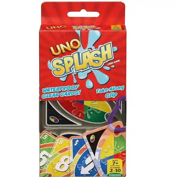 Uno es el Juego Que Puedes Jugar en Cualquier Momento y Con Cualquier Persona, y Ahora es Aún Más Fácil Jugar en Cualquier Lugar. Las Tarjetas de Plástico Duraderas Resisten el Agua Para Que Pueda Disfrutar Jugando en Cualquier Lugar, Incluso al Aire Libre. Esta Versión También Viene Con un Práctico Clip Que Mantiene Todas Las Tarjetas Juntas y se Adhiere a Una Bolsa de Playa, Mochila o Equipo de Campamento. Juega Haciendo Coincidir el Color o el Número, o Juega Una Carta de Acción Contra tu Oponente. Gana Puntos Siendo el Primero en Deshacerte de Todas Las Cartas en tu Mano. Contiene 108 Cartas. Juega a Uno Donde Quieras y no lo Olvides: Cuando Solo te Quede Una Carta, Grita "¡Uno!" Juega la Edición Especial Splash de Uno Tarjetas Plásticas Duraderas e Impermeables. el Práctico Clip Mantiene Todas Las Tarjetas Juntas y se Adhiere a Una Bolsa de Playa, Mochila o Equipo de Campamento. Juega Haciendo Coincidir el Color o el Número, o Juega Una Carta de Acción Contra tu Oponente. Gana Puntos Siendo el Primero en Deshacerte de Todas Las Cartas en tu Mano. No lo Olvide: Cuando Solo le Quede Una Tarjeta, Grite "¡Uno!" ¡Ahora Puedes Jugar a Uno en Cualquier Lugar!