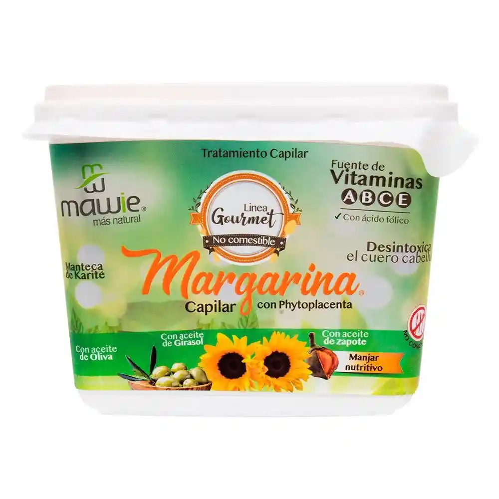 Mezcla equilibrada de oleos que hidratarán profundamente tu cabello. Tratamiento capilar Margarina® diseñado especialmente con aceites de zapote, oliva y girasol que aportan máxima humectación e hidratación para los cabellos secos, opacos y porosos. Se absorbe fácilmente, dejando el cabello suave y manejable. Es una fuente de vitaminas A, B, C, E y acido fólico que desintoxican el cuero cabelludo y crean un poder antibacteriano.