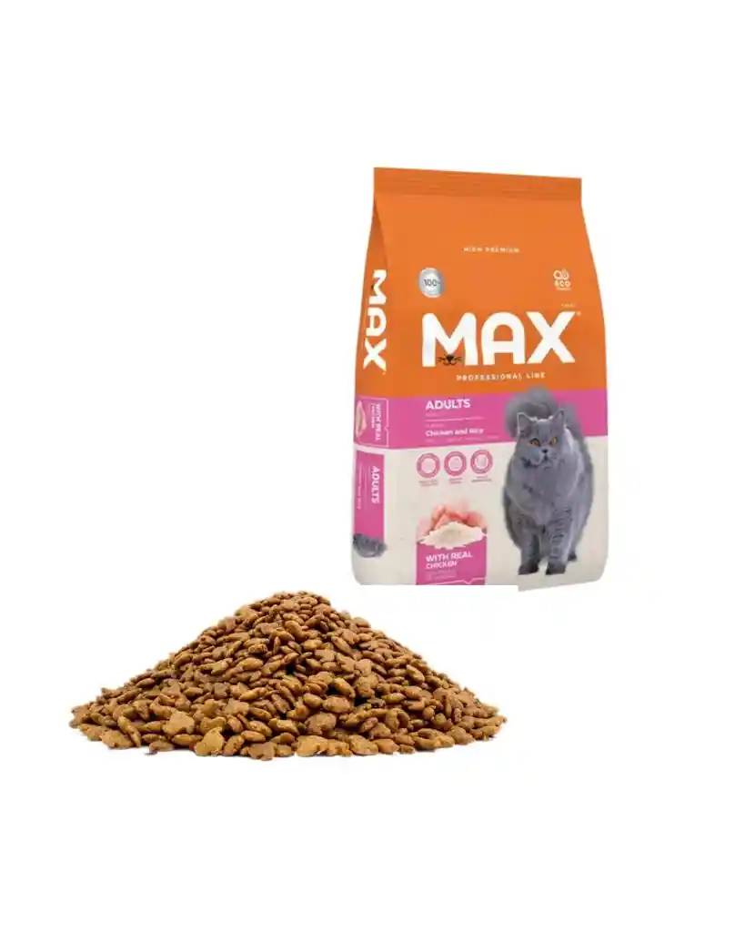 Max Cat Adultos Pollo y Arroz es la elección gourmet para tu felino, con 30% de proteína de pollo y sin aditivos artificiales, garantiza una nutrición superior; Cuida su tracto urinario, visión y corazón; Además, está enriquecido con extracto de Yucca Schidigera, minimizando el olor de las heces mientras potencia sus defensas naturales.
