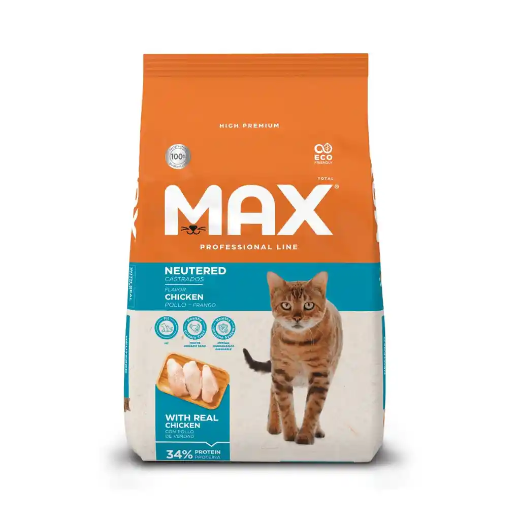 Max Cat Castrados es una línea de alimento seco (concentrado) de la marca Total Alimentos, diseñada específicamente para cubrir las necesidades nutricionales de gatos adultos que han sido esterilizados o castrados.