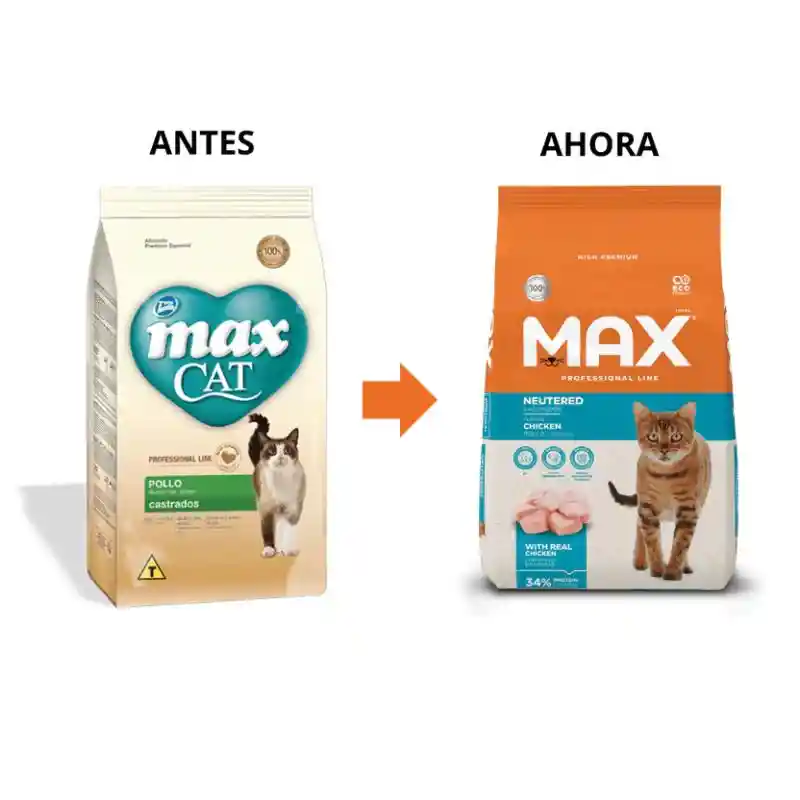 Max - Cat Castrados, esta compuesto de arroz, maíz integral, gluten de maíz, soja, harina de pescado, harina de menudo de pollo, grasa de pollo, levadura de cerveza, semilla de linaza, fosfato dicálcico, DL-metionina, Taurina, cloruro de sodio, cloruro de potasio, cloruro de colina, propionato de calcio, aceite de oliva, aceite de romero, ácido fosfórico, yucca Schidigera, BHA, BHT, hidrolizado de pollo y pescado, suplemento vitamínico mineral. Análisis Nutricional, Humedad (máx.) 12%; Proteína Bruta (mín.) 34%; Grasas (mín.) 9%; Fibras (máx.) 5.5%; materia Mineral (máx.) 10%; calcio (máx.) 1.5%; fósforo (mín.) 0.7%.