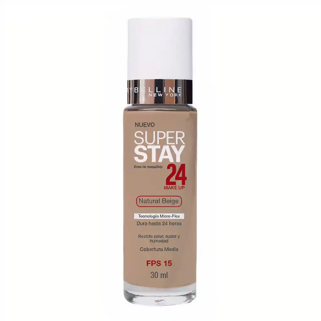 Base líquida de alta cobertura y larga duración. Ficha Técnica: Marca: Maybelline Modelo: H1845000 Tipo de Producto: Base de maquillaje Cantidad: 30ml Tipo de Piel: Todos Registro Invima: NSOC70696-16CO Profundidad ITEM: 2.7 cm Ancho ITEM: 2.8 cm Altura ITEM 11.2 cm Características de la Base Maybelline Super Stay 24h Natural Beige X 30ml Obten alta cobertura todo el día.Superstay 24H cubre tus imperfecciones y unifica el tono, resistiendo al calor, sudor y humedad.