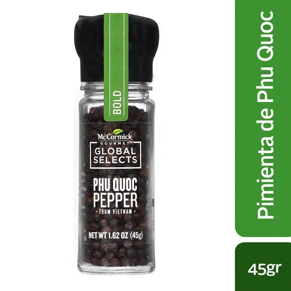Molinillo de Pimienta negra proveniente de la Isla de Phu Quoc en Vietnam. Esta pimienta se caracteriza por su sabor fuerte y pungente.