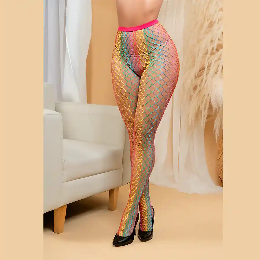 Estas medias tipo pantalón en malla son el toque perfecto para elevar cualquier look. Su diseño ajustado y seductor enmarca tus piernas con actitud, sensualidad y un estilo que no pasa desapercibido. Ya sea con lencería, vestidos o looks urbanos, siempre suman poder y personalidad. Características: Material: 90% polyamide + 10% Elastane Talla: Única Color: Arcoíris Incluye: Medias