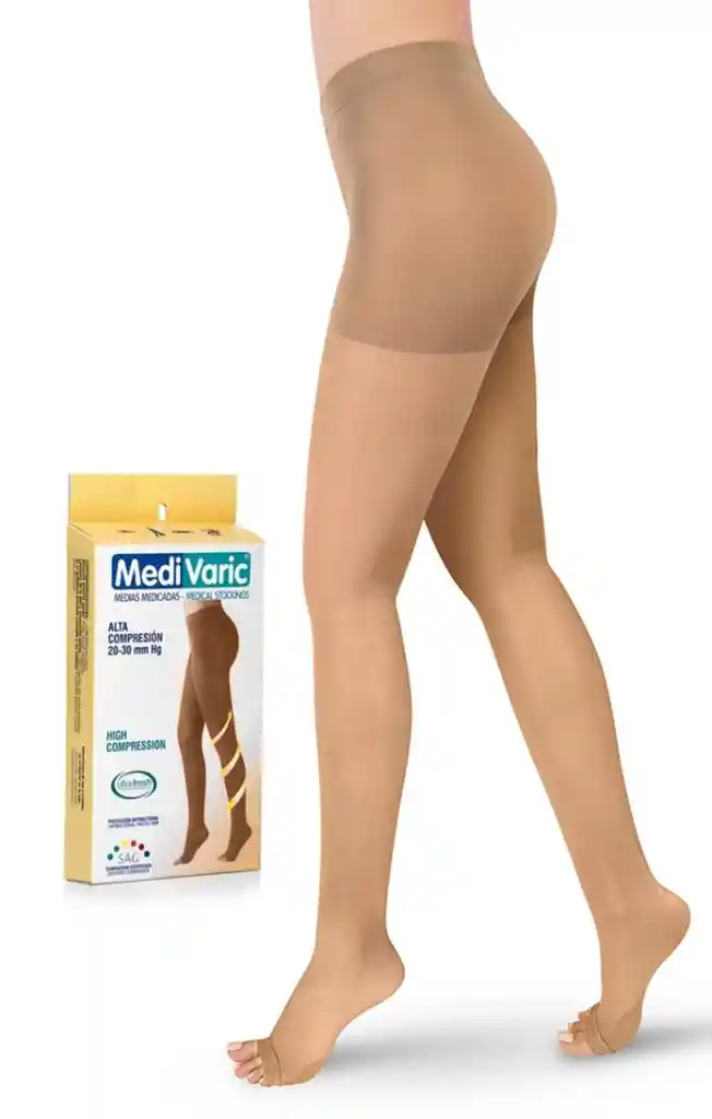autoajustable, que no produce marcas ni torniquetes. Pierna: compresión graduada que facilita la circulación de retorno. Puntera: abierta con dedos libres con calzador en seda polyester para mayor facilidad en su postura.