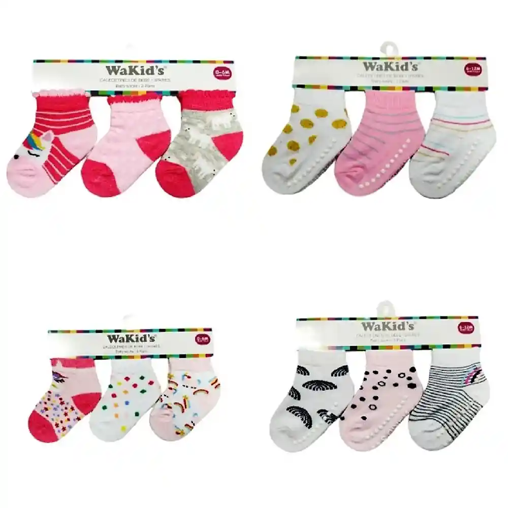LA OFERTA CONTIENE TRES (3) PARES DE MEDIA Divinas y espectaculares medias de hermosos diseños y colores surtidos, son ideales para tu bebé, con una talla adecuada para los 0 a 6 meses, te ayudarán a proteger los pies de tu pequeño en todo momento. Son un maravilloso regalo para los pequeñitos. Son fabricadas con materiales de alta calidad, algodón 70%, nilon 20% y acrílico 10%, convenientes para ti, como también cómodos y lindos para tu bebé. Estas medias son importadas, 100% originales. Hipoalergénicas. ¡Les encantará! Características Diseños surtidos 100% originales Hipoalergénicas