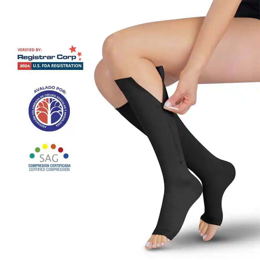 Medias de compresión mediana 15-20 a la Rodilla, con los dedos libres y con Cremallera Las medias de compresión mediana con cierre o cremallera Zipper Socks previenen las venas várices y estimulan el descanso en las piernas ayudando a controlas las telangiectasias o arañitas. Mejora considerable en la circulación y el retorno venoso. Ayudan a reducir la hinchazón de las piernas. Especiales para tratamiento y control de venas várices. Tejido resistente con hilos importados. Sensación de suavidad al tacto. Elimina síndrome de piernas cansadas. Adaptable a cualquier tipo de calzado, siendo muy discretas por sus colores. El síndrome de piernas cansadas normalmente se manifiesta por medio de hinchazón y malestar en la pantorrilla y en los pies. Las medias Zipper Socks eliminan ese cansancio y pesadez por ser medias de compresión 15-20 mmHg, y dan confort gracias a la textura del material con el que son fabricadas, que se adapta perfectamente a las curvas de las piernas. Estas medias de compresión de grado medio son altamente recomendadas para controlar y tratar las venas varicosas, también llamadas venas várices o simplemente varices. Estas medias son excepcionales en la reducción del dolor de piernas, previenen calambres musculares y mejoran la circulación sanguínea, entre otros beneficios. También identificadas como medias de compresión o medias compresivas, estas medias proporcionan un alivio sobresaliente para las piernas. Cómo ponerse las medias de compresión: