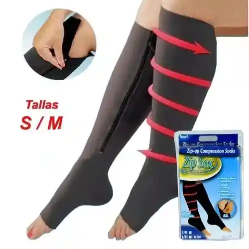 Control Varice. Alivia el dolor y el cansancio. Cremallera lateral que facilita su postura. Banda elástica para ajuste perfecto. Compresión graduada decreciente que favorece la circulación. Talón anatómico con refuerzo para proteger del calzado. Recomendada por especialistas para controlar el cansancio, pesadez y calambres. De Facil postura por el sistema Zipper (Cremallera) Aumentan la Circulación y a su vez disminuyen la hinchazón de las piernas. Diseño con dedos libres Alivia Fatiga y mejora considerablemente el síndrome de piernas cansadas Diseñado para aumentar la circulación sanguínea y reducir la inflamación. Rapido y Comodo de llevar No Visible debajo de la ropa Built in de la cremallera hace que sea fácil de llevar Diseño de punta abierta TALLA DISPONIBLE S/M