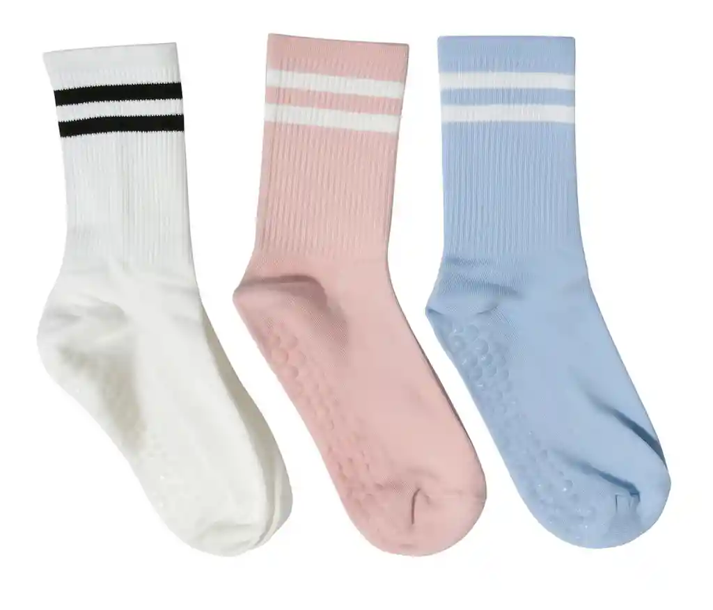 Medias deportivas x 3 pares, talla única, color: rosado claro, blanco y azul claro, con antideslizante.