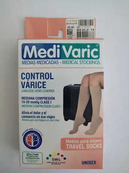 Medias viajero de compresión mediana especialmente diseñadas para personas que realizan viajes regularmente para evitar dolor de piernas. Diseño moderno y atractivo. Fibras de excelente calidad, durabilidad y elongación que garantizan su compresión. Estas medias tienen un acabado antibacteriano que ayuda a controlar hongos y bacterias generadas por el sudor. Indicaciones Terapéutica. Venas reticulares. Várices primarias. Dolor. Pesadez. Medias para viajeros Especificaciones Compresión graduada decreciente que favorece el retorno venoso. Talón verdadero para mayor comodidad. Banda elástica para un ajuste perfecto. Los médicos las recomiendan para controlar el cansancio, la pesadez y los calambres. Especiales para personas que realizan largos trayectos o viajes, reducen dolor de piernas y mejoran circulación