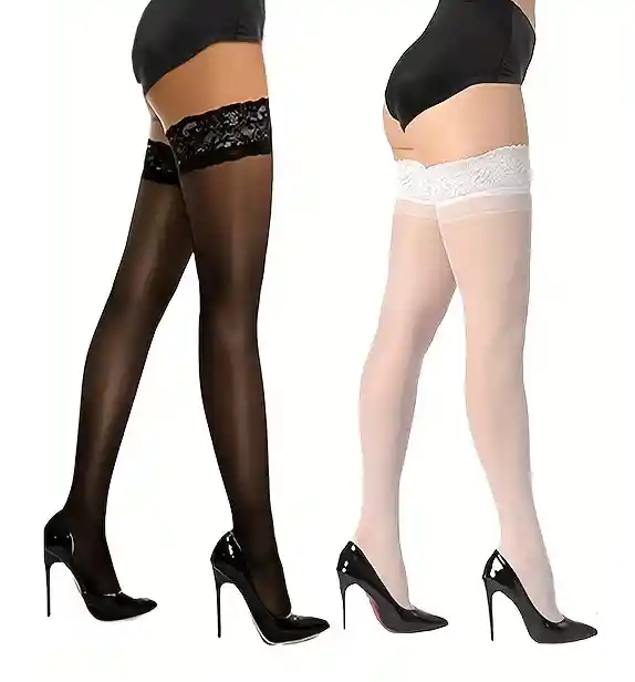2 pares de medias veladas por encima de la rodilla con encaje de mujer. Talla M hasta una XL. Pares negro y blanco. Llegan por encima de la rodilla y tienen ribete de encaje. Medias transparentes veladas hechas de tela cómoda y duradera (Lavar a mano únicamente), con un diseño de color sólido, adecuadas para botas, faldas, y ocasiones sexys.