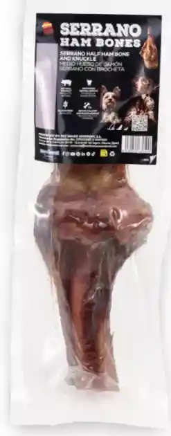 Brocheta de medio hueso de jamón serrano. Alimento complementario para perros de razas pequeñas y medianas.