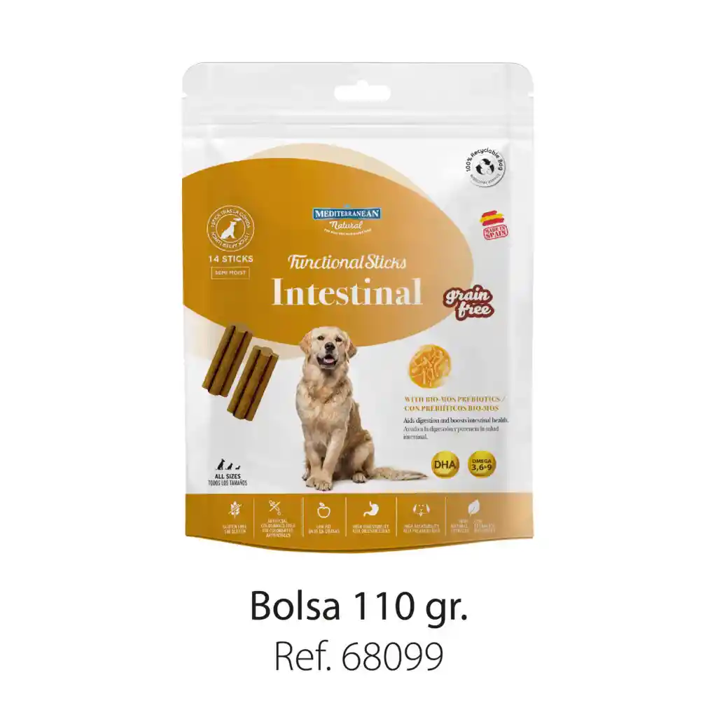 Los Functional Sticks de MEDITERRANEAN NATURAL son un complemento alimenticio elaborado con productos de primera calidad. Es un snack formulado sin cereales, favoreciendo la asimilación de los nutrientes y reduciendo la posibilidad de malestares digestivos. Se presenta en 6 formatos y cada uno de ellos aporta beneficios específicos para tu perro: Urinary, Salud Bucal, Intestinal, Antiestrés, Piel y Pelo y Articulaciones. Elaborados con carne y pescado provenientes de la cadena de alimentación humana, los Functional Sticks no contienen cereales, gluten, colorantes artificiales, transgénicos ni ácidos grasos trans y son fuente natural de Omega 3,6 y 9. Contribuye al desarrollo de un sistema inmunitario sano. Ayuda a reducir el riesgo de enfermedades diarreicas. Composición 21.5% carne de pavo, 18% salmón, 18% atún, glicerina vegetal, harina de garbanzo, 8% prebióticos, 7% jamón serrano, fécula de patata, aceite de salmón, zanahoria seca, aceite de girasol, yuca, minerales. Aditivos: Antioxidantes: extractos tocoferoles. Aromatizantes: extracto de romero Componentes analíticos Proteína: 28.2%, grasa bruta: 7.2%, ceniza bruta: 8.8%, fibra: 2.2%, humedad: 15.2%, 301 Kcal/100g., omega3: 0.27g/100g, omega6: 1.7g/100g, omega 9: 2.4g/100g. Propiedades: Ayuda a la digestión y potencia la salud intestinal. Dosificación diaria: 1 barrita tras cada comida. (14 unidades). Utilizar de forma regular como premio.