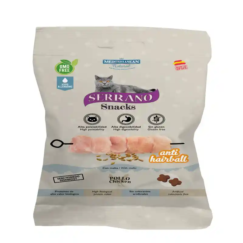 Los Serrano Snacks de MEDITERRANEAN NATURAL para gatos se presentan en pequeñas piezas, ideales para la degustación por su tamaño, textura y sabor. Elaborados con carne y pescado cocidos a baja temperatura, aportan todos los nutrientes de la materia prima y son el complemento alimenticio ideal para tu gato. No contienen gluten, colorantes artificiales, transgénicos ni ácidos grasos trans. Hipoalergenic Se presentan en cuatro sabores: pollo, foie, sardina y salmón y atún. Los dos primeros son un snack hipoalergénico y los de pescado aportan Omega 3 y 6 en las proporciones ideales, altamente beneficiosas para la salud de tu gato. Además, contienen ingredientes que ayudan a prevenir la formación de bolas de pelo, favoreciendo el correcto funcionamiento gastrointestinal. 55% chicken meat, 15% turkey meat, vegetal glycerin, 6% serrano ham meat, rice, 4% malt extract.
