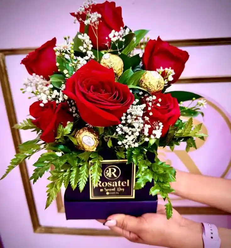 Caja cuadrada con rosas mas follaje y chocolates