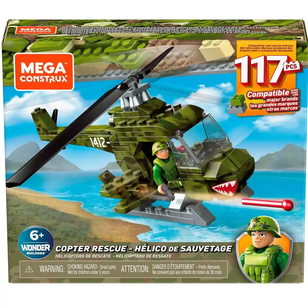 "Vuela al cielo con el helicóptero de rescate resistente y construible. Completo con una boca llena de colmillos impresa en la cabina, el juego de construcción Copter Rescue cuenta con 117 piezas de construcción, así como una hélice giratoria y un lanzador de proyectiles funcional. Lleva tu microfigura de acción del ejército al helicóptero y comienza a rescatarlo. Juego de construcción de helicóptero militar con hélice funcional, lanzador y 3 proyectiles, y piezas decorativas impresas. 1 microfigura de acción militar articulada que puede sentarse en el helicóptero. Gráficos y diseños premium impresos directamente en ladrillos."