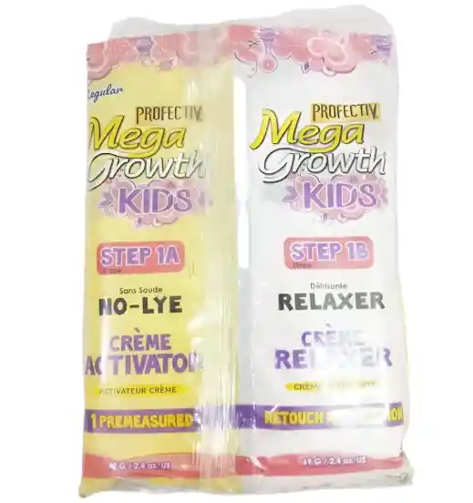 MEGA GROWTH KIDS PROFECTIV SOBRE 138 G : es un sistema de relajante capilar sin lejía diseñado para alisar suavemente, proteger y fortalecer el cabello de los niños. Enriquecido con aceites naturales y proteínas, previene la rotura, las puntas abiertas y la sequedad, promoviendo un crecimiento saludable, mayor elasticidad y brillo, facilitando el manejo del cabello. Principales usos y beneficios: * Alisado Suave: Especialmente formulado para ser gentil con el cuero cabelludo delicado de los niños, brindando un alisado sedoso. * Fortalecimiento: Ayuda a reparar y fortalecer el cabello frágil desde adentro, reduciendo la rotura hasta en un 100%. * Hidratación: Contiene aceites (como coco, oliva) y mantecas (karité, cacao) que nutren profundamente y protegen contra la sequedad. * Protección: Defiende el cabello contra daños por calor y peinados frecuentes. * Facilidad de uso: El sistema "Crème on Crème" facilita la mezcla y aplicación, a menudo incluyendo champú neutralizante y acondicionador. Este producto es ideal para alisar y mantener el cabello saludable de los más pequeños, facilitando su peinado y mejorando su textura.
