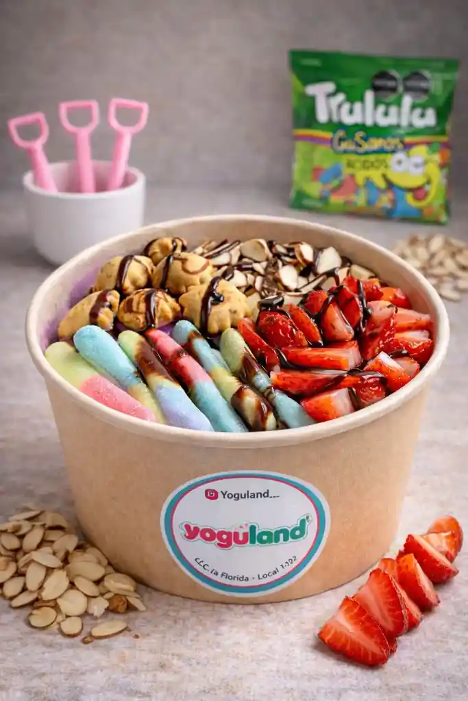 Nuestra presentación más grande para disfrutar sin límites: 1 litro de helado a base de yogurt, con cuatro sabores a elección, cuatro toppings seleccionados por ti y una salsa para coronar tu mezcla, ideal para compartir y crear la combinación perfecta en cada cucharada.