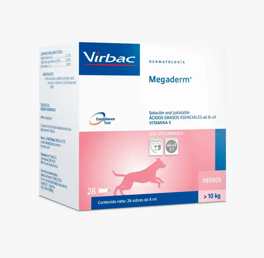 es un innovador complemento alimenticio formulado especialmente para mejorar la salud de la piel de tus mascotas y combatir la pérdida excesiva de pelo. Con una mezcla única de ácidos grasos esenciales omega 3 y omega 6 en proporciones óptimas, Megaderm es la solución perfecta para mantener la piel de tu mascota en perfecto estado.