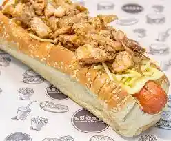 (pan, salchicha ranchera, salchicha suiza, pollo, jamón, tocineta picada, lechuga Batavia, papita chongo, queso mozzarella, salsas de la casa).