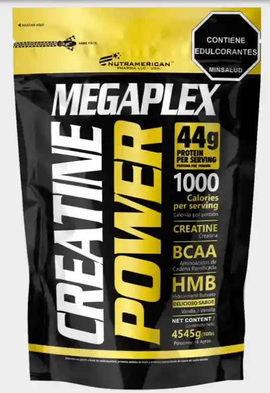 Megaplex Creatine Power es la mejor proteína de suero, hipercalórica que incluye en su innovadora fórmula 3000 mg de Creatina, HMB, BCAA, 44g de Proteína, 1000 calorías por porción y fuentes de Carbohidratos con diferentes velocidades de absorción. Registro Invima RSA-0007426-2019. Proteína de suero de leche. Ideal para personas que deseen aumentar su ingesta calórica. 3 g Creatina. 500 mg HMB (Hidroximetilbutirato). 44 g por porción de proteína 1000 Calorías. SABOR VAINILLA