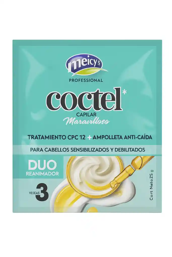 💚 Meicy’s Professional Cóctel Capilar Maravilloso Descripción general: El Cóctel Capilar Maravilloso de Meicy’s es un tratamiento profesional intensivo diseñado para revitalizar, fortalecer y reparar cabellos sensibilizados o debilitados. Su fórmula combina el Tratamiento CPC 12 con una ampolleta anti-caída, creando un dúo poderoso que nutre profundamente y devuelve la vitalidad al cabello en tan solo 3 minutos. 🌟 Beneficios: Fortalece la fibra capilar desde la raíz hasta las puntas. Previene la caída del cabello, estimulando el crecimiento saludable. Repara el daño causado por procesos químicos, plancha o secadora. Aporta suavidad y brillo intenso desde la primera aplicación. Su acción revitalizadora en 3 minutos deja el cabello más resistente y sedoso. 💆♀️ Modo de uso: Lava el cabello y elimina el exceso de agua. Aplica el contenido del sachet (tratamiento + ampolleta) de medios a puntas. Masajea suavemente para distribuir el producto. Deja actuar 3 minutos. Enjuaga con abundante agua. ✨ Ideal para: Cabellos débiles, quebradizos o con caída. Cabellos tratados químicamente o deshidratados. Uso profesional o en casa para mantener el cabello fuerte y saludable.