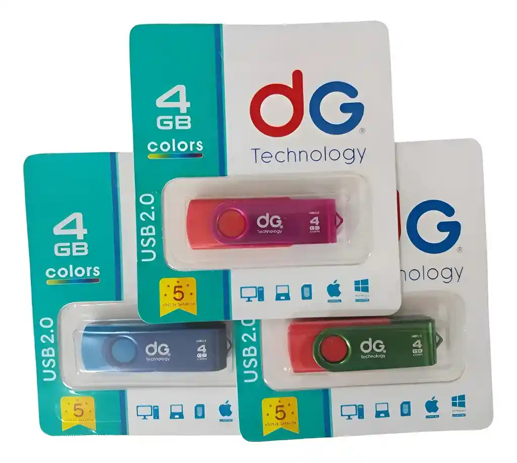 MEMORIA USB 4GB DG ORIGINAL CON GARANTÍA COLORES SURTIDOS DESCRIPCIÓN Muy fácil de instalar. Ideal para Videos en alta definición. Velocidad de Transferencia Clase 4. Conexión Usb 2.0 Velocidad de lectura: 14mb/s Velocidad de escritura: 4mb/s CARACTERÍSTICAS Medidas: Largo: 6cm Ancho: 2cm Velocidad Lectura: 14MB/s Velocidad Escritura: 4MB/s Compatible con todos los sistemas operativos QUE INCLUYE LA COMPRA x1 USB
