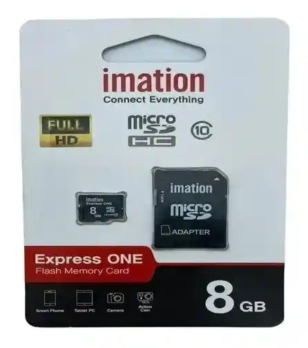 Memoria Micro SD Imation de 8gb Clase 10 La micro SD DE Imation es una tarjeta de memoria flash extraíble utilizada para almacenar información digital, como programas y archivos. Las tarjetas SD se utilizan comúnmente en teléfonos celulares y en otros dispositivos portátiles para ampliar el almacenamiento de la memoria ROM. CARACTERISTICAS: -Micro SD marca IMATION -Express ONE Flash Memory Card -Micro SDHC Clase 10 + Adaptador SD -Velocidad de lectura: 70 MB/S – FULL HD -100% ORIGINAL -Compatible con cualquier modelo o marca de SMARTPHONE, COMPUTADOR, TABLET Y CÁMARA. CONTENIDO: -1 Memoria Micro SD Imation de 8gb