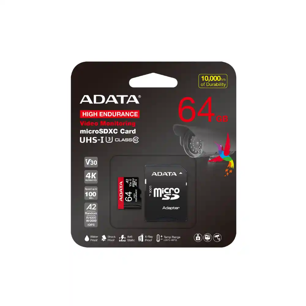 Tarjeta microSDXC/SDHC 64GB UHS-I de alta resistencia Capacidad 64 GB Estándar SD 6.0 Clase de velocidad Velocidad UHS : Clase 3 Clase de velocidad : Clase 10 Clase de velocidad de vídeo : V30 Clase de rendimiento de la aplicación : A2 Voltaje de trabajo 2,7V – 3,6V Rendimiento de lectura y escritura Hasta 100 MB/80 MB por segundo* (64GB) – * La velocidad de lectura y escritura se basa en las pruebas internas de ADATA; el rendimiento real puede variar. Temperatura de funcionamiento -25°C ~ 85°C Dimensiones (LA x AN x AL) 15 x 11 x 1 mm Peso 0,25 g Certificaciones CE, FCC, VCCI, EAC, RCM, UKCA, IC Compatibilidad Teléfono inteligente / Tableta / Grabadora para salpicadero / Cámara de movimiento / Cámara de vigilancia Nota 1. Asegúrese de que el dispositivo admita la especificación SD 6.0 o posterior para lograr el mejor rendimiento de nivel A2. 2. Grabación Full HD a 26 Mbps a 30 grados hasta 10 000 horas de vídeo con tarjeta de 64 GB