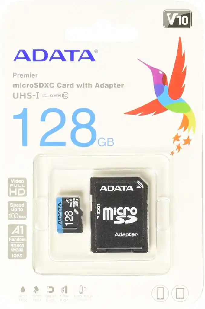 MicroSD Clase 10 A1 Soporta grabación de vídeo Full HD 1080p Resistencia al agua, a golpes, a rayos X y antiestática Transferencia más rápida de hasta 100MB/s Incluye adaptador para tarjetas SD.