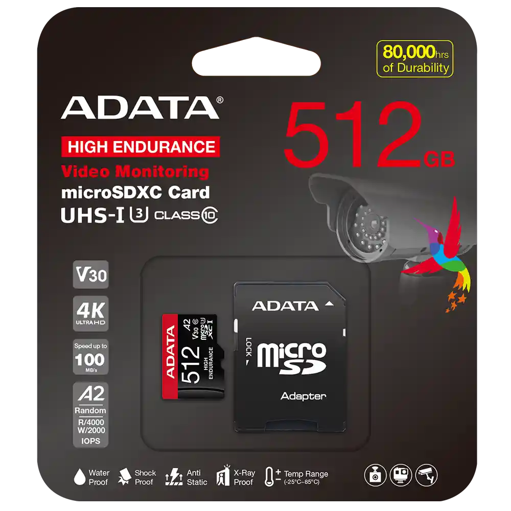 Las tarjetas ADATA High Endurance microSDXC/SDHC UHS-I son tarjetas de memoria de alta resistencia con velocidad de video Clase 30 (V30) que están diseñadas específicamente para grabación continua y regrabación constante. Son ideales para cámaras de tablero y sistemas de vigilancia, y cualquier otra aplicación que requiera resistencia para grabar sin parar. Es más, con una calificación de rendimiento de aplicaciones Clase 2 (A2), pueden brindar a los usuarios una experiencia de aplicación más rápida y fluida. Además, pueden soportar entornos extremos gracias a sus construcciones impermeables, a prueba de golpes y resistentes a los rayos X. Especificaciones: Capacidad: 512GB Estándar: SD 6.0 Clase de velocidad: Velocidad UHS: Clase 3 Clase de velocidad: Clase 10 Clase de velocidad de vídeo: V30 Clase de rendimiento de aplicación: A2 Tensión de trabajo: 2,7 V - 3,6 V Rendimiento de lectura y escritura: hasta 100 MB/85 MB por segundo* (128 GB/256 GB/512 GB) Temperatura de funcionamiento: -25°C~85°C Dimensiones (largo x ancho x alto): 15x11x1mm Peso: 0,25 gramos Certificaciones: CE, FCC, VCCI, EAC, RCM, UKCA, IC Compatibilidad: Smartphone Tableta Grabadora de tablero Cámara de movimiento Cámara de vigilancia Garantía: 36 Mese
