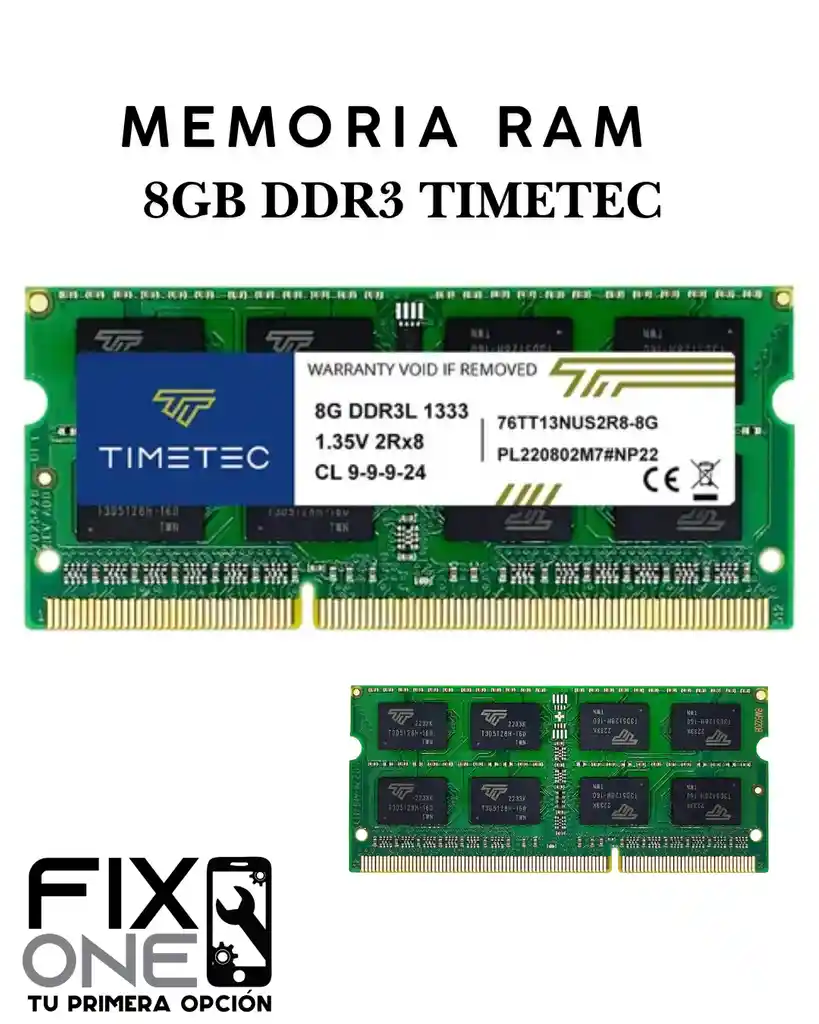 Memoria Ram 8GB Marca: Timetec Tecnología: DDR3 Capacidad por Unidad: 8GB Velocidad: 1600Mhz Tasa de Transferencia: 12800 MB/s Compatible con: Mac Book Pro, iMac, Mac Min ⚠️ valida la compatibilidad ✅Imagen de referencia