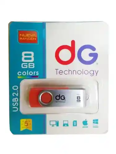 Memoria USB 2.0 de 8GB marca DG Technology 100% CALIDAD -Colores sujetos a disponibilidad de inventario -Compatible con una gran variedad de computadores, TV y Reproductores de música y video. -Velocidad para Transferencia de Datos: Lectura 14 MB/s Escritura 4 MB/s.