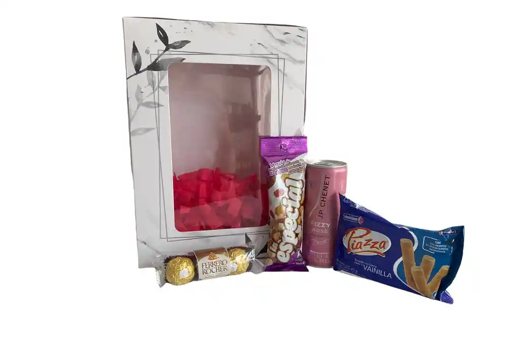Caja para fechas especiales y momentos para nunca olvidar. Contiene Lata de JP. Chenet 250ml, Ferrero Rocher x3, Piazza, Maní la especial.