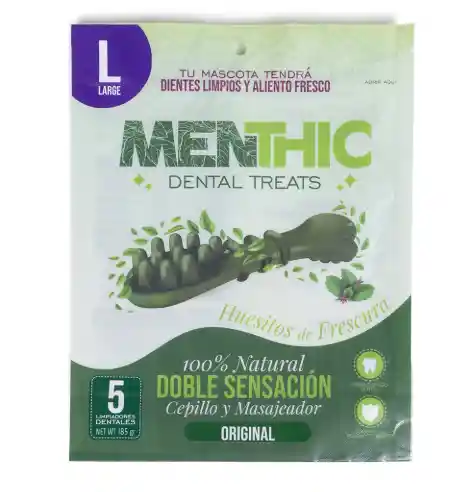Los Menthic Dental Treats (Huesitos de Frescura) son snacks dentales de tamaño grande (L), diseñados específicamente para perros de razas grandes. Este empaque de 185 g contiene 5 limpiadores de origen 100% natural que ofrecen una "doble sensación" al funcionar como cepillo y masajeador de encías. Su fórmula original ayuda a combatir la placa y el sarro, garantizando una higiene oral profunda y un aliento fresco para tu mascota.