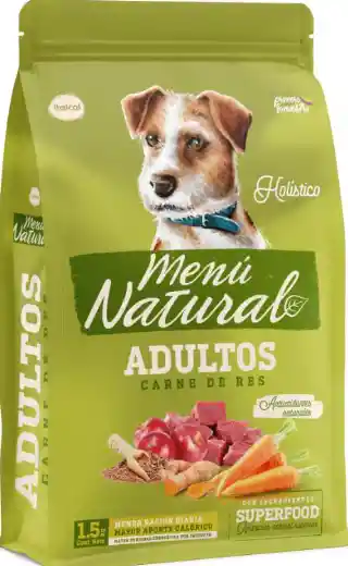 Menú Natural Carne de res es una fórmula (holística) que no contiene ingredientes súper procesados, sobresalen los ingredientes provenientes de la naturaleza, promueve una nutrición equilibrada, generando salud integral en perros adultos de todas las razas (hasta 30 kg). Los principales ingredientes naturales de la fórmula son: Carne de res, inulina, avena, cúrcuma, semillas de linaza y probioticos así mismo su croquetas tienen incrustadas zanahorias y manzanas deshidratadas otornado una apariencia mucho más natural al no tener una forma definida.