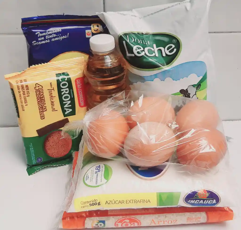 Nuestra Bolsa contiene; 1 Libra De Arroz 1 Libra De Azúcar 1 Aceite De 250ml 5 Huevos AA 1 Litro De Leche 1/2 Libra De Chocolate 1/4 De Café