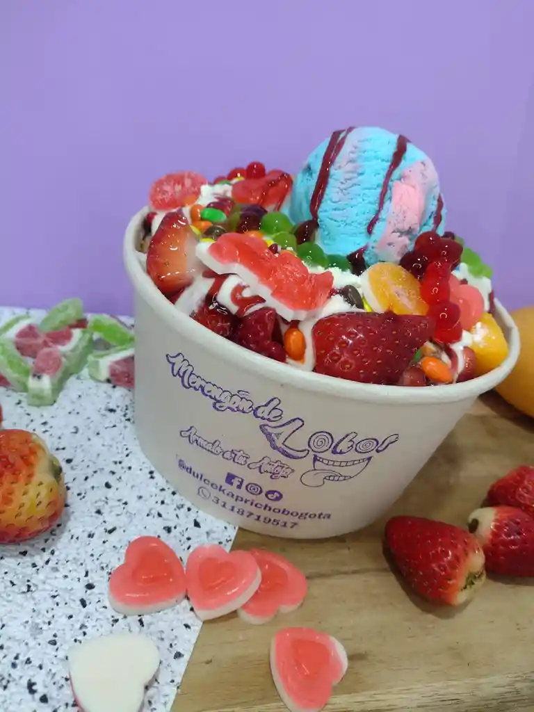 Merengon que te volvera Dmente con fruta fresca, un espolvoreado dos toppings a eleccion, burbujas explosivas, la salsa que prefieras y la salsa que desees